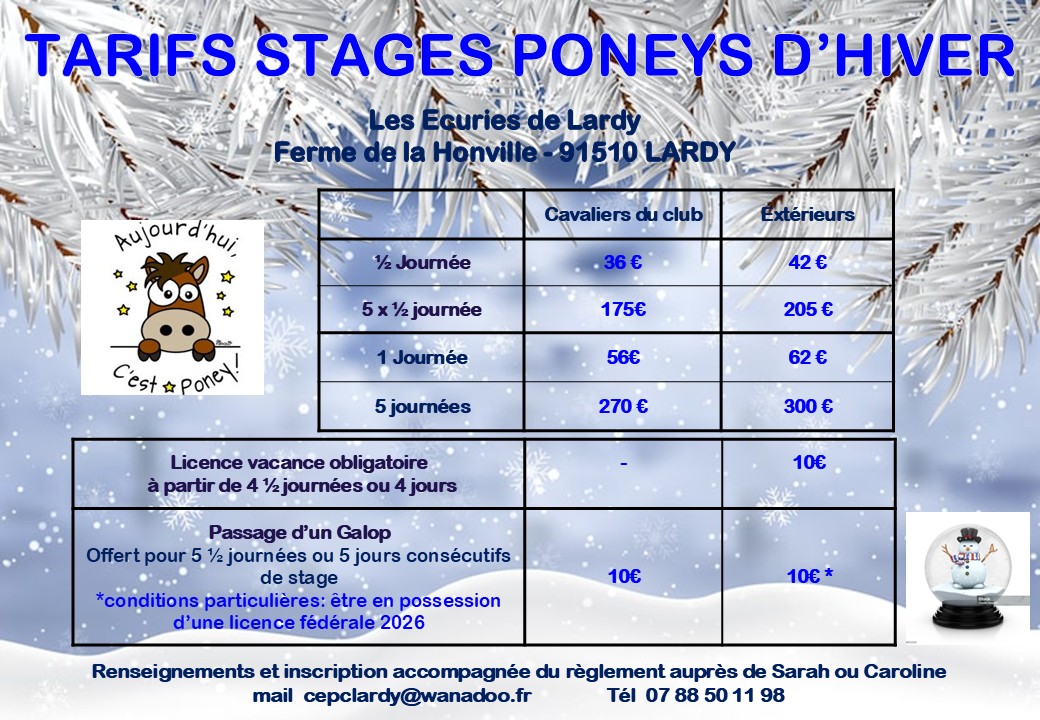 Nous disposons de 20 poneys, d’un manège couvert et d’une carrière éclairée, de même qu’une salle chauffée et une aire de pansage et des paddocks spécifiques pour les poneys, aux ECURIES DE LARDY.